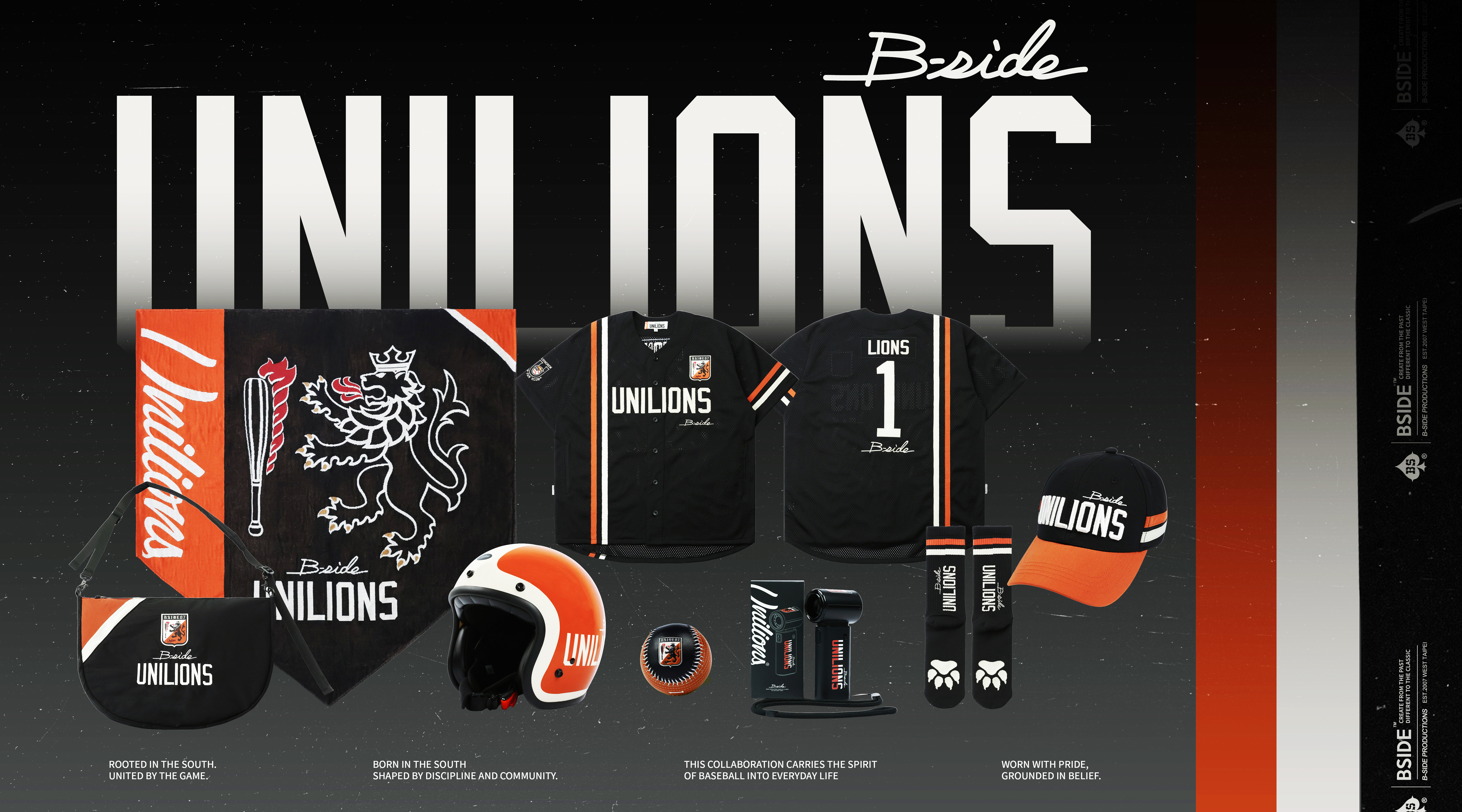 本次 UNILIONS 攜手 B-SIDE以「黑」作為主視覺基調,象徵紀律、信念與不妥協的態度,同時注入UNILIONS的經典橘色,並以王者之獅為核心概念設計主題圖像視覺,再將直橫線條融入復古競技氛圍結合棒球場上的專注與團隊意志將運動信仰轉化為日常穿著的一部分。整體系列線條簡潔、輪廓俐落,在低調中藏著細節,讓棒球不只存在於場上而是自然融入生活風格之中。